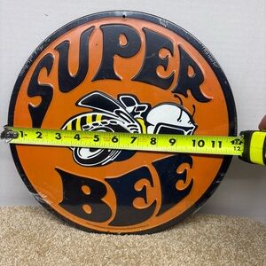 The product is a vintage-style 12" metal sign featuring the iconic Dodge Super Bee emblem. The sign is designed in orange and black, reflecting the classic colors associated with American automobiles. This reproduction sign would be a perfect addition to any automotive enthusiast's collection, showcasing a piece of Dodge history with a detailed embossed design.