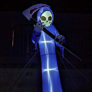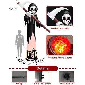 * 12 Ft Giant Scary Halloween Inflatable Grim Reaper: The Halloween inflatable size is 12*5.7*4.7 Ft (H*L*W); Designed as a grim reaper holding a scythe; Copyright Certificated Model
