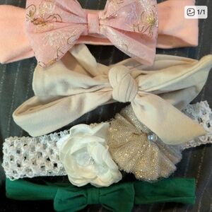 A beautiful collection of pink, beige, and floral headbands. Features various shades of pink with floral accents.