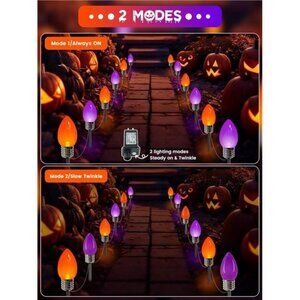 C9 Halloween Pathway Lights: Each string light feature 6 individual C9 LED bulbs and 6 stakes in spooky orange and purple. Total length 26.6ft, space between LEDs: 24.4 inches. One pack contains 2pcs of string lights, total 53.2FT string lights with 12 LED C9 bulbs