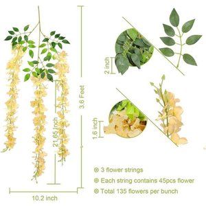 🧿✔Package Included:12 x artificial flowers vines.Size of each fake flower vine: About 3.6 Feet in length per artificial wisteria with 3 branches,each string is 21.65”,more flower in each string, extra thick and beautiful.