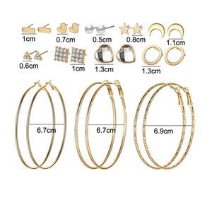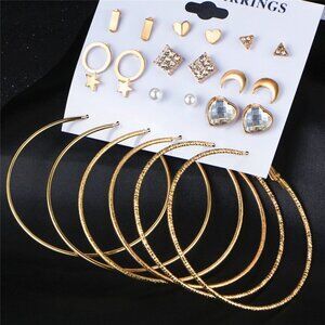🔥12 Pair Stud Earring Set Mix for Women Gold Color Geometric Crystal Heart Triangle Star Moon Big Round Circle, F271