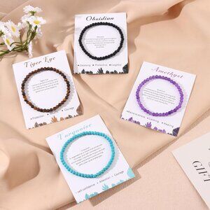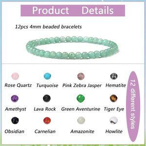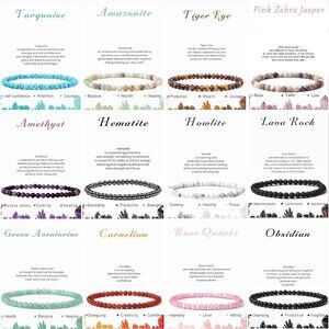 This set of 12 natural stone beaded bracelets is perfect for adding a touch of spiritual charm and vibrant energy to your look. Each 4 mm bead bracelet features a different gemstone, like turquoise, amazonite, tiger eye, amethyst, lava rock, rose quartz, and obsidian, all on an elastic band for a comfy fit. The 7.1-inch length makes them suitable for most wrists, and their polished, smooth finish feels soft against the skin. These bracelets are more than jewelry—they're about harnessing positive energy, balance, and hope. Great for meditation, yoga, or everyday layering, they also make thoughtful gifts for birthdays, holidays, or special occasions. Each bracelet comes with a meaningful message card, highlighting the unique energy and symbol of each stone. Ships quick from a smoke-free home. Friendly seller—happy to bundle and save. Reasonable offers welcome.