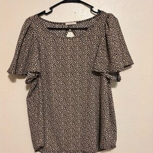 This relaxed blouse by 12 Pm By Mon Ami features a chic black and white pattern with flutter sleeves and a cut-out design. The lightweight fabric drapes beautifully, making it perfect for both casual and business casual settings.