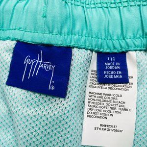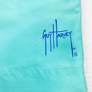 Guy Harvey volley swim trunks in an aqua color they call "Floriday Keys." Elastic waist with drawstring. They do have a mesh underwear type lining. Two side hand pockets. The billfish print appears when the swim trunks are wet. Tag size large. See measurements below. MSRP: $60