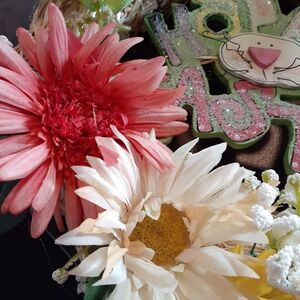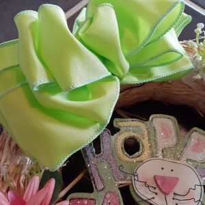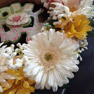 12" STRAW BASE EASTER WREATH. Easter plaque in the middle, spring silk gerber daisys, and a statement Handmade Spring Bow. Lightweight, all treasures are secured with hot glue. FLUFF & HANG!