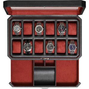 12 Slot Leather Watch Box with Valet Drawer - Microsuede Liner, (Black/Red)