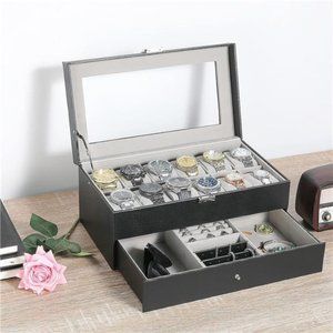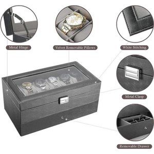 12 Slots Watch Box with Drawer, PU Leather Boxes w/ Glass Lid & Pillow - Black