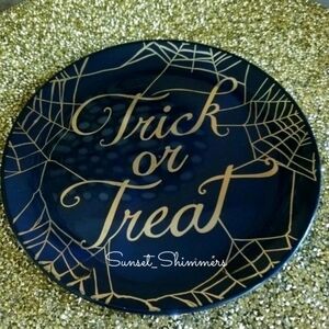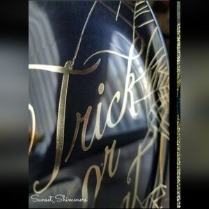 Unbranded, REUSABLE, Black, heavy Duty PLASTIC , Shiny Gold  "Happy Halloween" Spider Web Appetizer/ Salad/ Dessert Plates. Set of 12. Condition is New, Sealed in plastic. Measures 7.5" round. Free Shipping! Hand wash only. Not Microwaveable. If you like to mix and match, we also have the matching, Skeleton holding a Cocktail glass, saying "cheers" (shown in the last pic) available in another listing . Thanks for looking =)