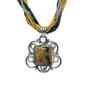 12 Strand Green & Silver Seed Bead Necklace With Jasper Pendant (5891)