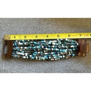 12 Strands Blues & Browns Beaded Stretch Bracelet With Wooden Buckle Closure