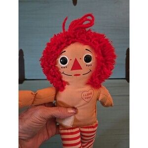This 12" vintage 1980's Raggedy Ann doll cloth with the I Love You heart is a charming addition to any doll collection. The red-haired doll, made of cloth and standing at 12 inches tall, embodies the timeless appeal of the Raggedy Ann & Andy franchise. With its vintage charm and classic design, this girl doll from the 1980s is sure to delight collectors and fans of nostalgic toys.