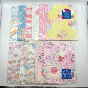 12 vintage gift wrap sheet packs from Forget Me Not / American Greetings. The packs feature babies, baby shower, lambs, baby boy, and baby girl. Each pack contains one sheet. Some packs have cards with them. While the packs are wrapped in factory plastic, several of them have dirt, stains, debris, and sticker remnants on the front and back. This is only on the plastic covering and does not affect the wrap sheets or cards in any way.