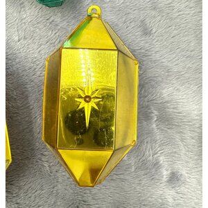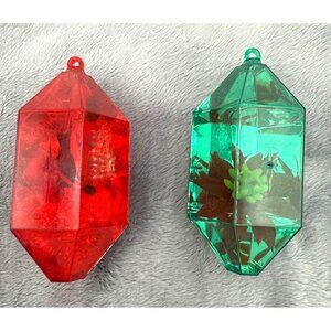 A set of 12 vintage Jewelbrite Diorama Ornaments diamond-shaped plastic ornaments featuring intricate embedded floral designs and holiday-themed elements. Each ornament has a unique color and pattern, offering a classic aesthetic suitable for seasonal decorations or collectible displays. Durable and lightweight, these ornaments add a nostalgic touch to decor.