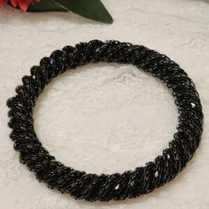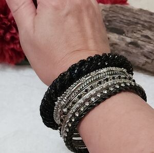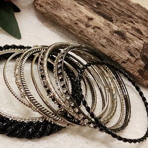 12 Vintage Silver Toned and Black Metal Bangle Set
