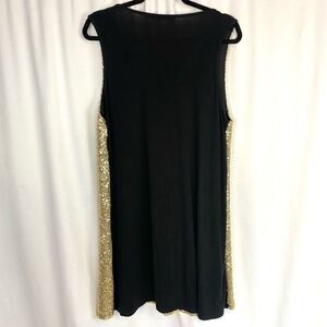 Live it up in this sparkling dress! Gold sequins adorn the front of this soft black T-shirt like material. A-line, v-neck, pullover style.Loose fitting and comfortable,