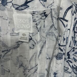 Good, preloved condition. 120% Lino Etched Indigo Floral Print Poet Style Top Pintucked sz IT 38, US 2. V-neck. Pintuck detail. Poet collar. Linen. White with blue floral detail.