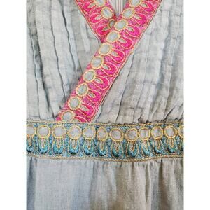 Style: Embellished linen maxi dress. 100% Linen. Glittery embroidery around neckline, around waist, and at ends of sleeves. Crossed-over bodice with heavy pleating. 3/4 length sleeves, casual fit with button closure at wrists. Attached belt that ties around back of waist, extra long and with satin finish. High waist. Woven fabric. Tiered skirt has ruffles on one layer. No stretch. Hand Wash or Dry Clean. Made in Italy