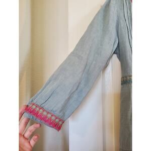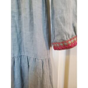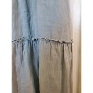120% Lino Paris Linen Blue Embroidered Tiered Prairie Boho Maxi Dress, Sz Medium