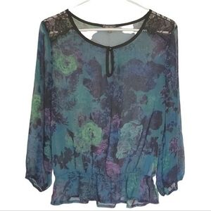 1201 * Lily Rose Floral Sheer Blouse Blue Green Size L