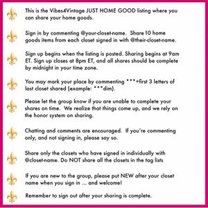 Vibes4Vintage Share Group invites you to sign up, share your home goods and have a fun time! We share both old and new home items in this group. We believe that “your Vibe attracts your Tribe“ and our vibe is open, friendly, fun, and we hope zero drama! We encourage everyone to share, chat, browse, and make some sales!