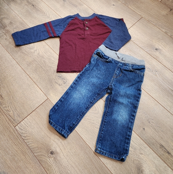 Stylish boys outfit featuring a burgundy and blue long sleeve shirt paired with classic blue jeans.