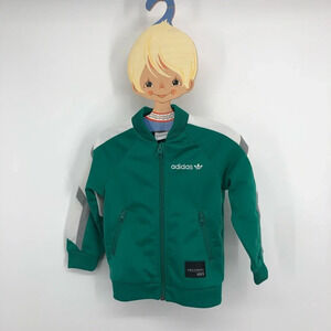 Sporty little babe. Green grey and white zip up track jacket. Size 12-18 months. A little dirt on the left arm never hurt a kid. Otherwise great.