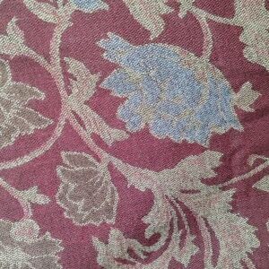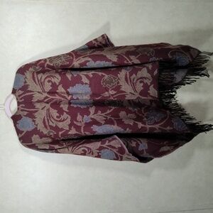 Accessory Street burgundy, blue, and tan floral print sweater knit poncho, one size fits most. In excellent pre-owned condition. Solid back with slits on the side and an open front. Fringe trim. Underarm to underarm about 58" around, length 30" - 43". Item number 12250-190-139-101525.