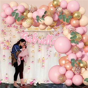 🧿Pink Balloon Garland Kit: Our baby shower decorations for girl is worth having! Package including 2 pcs 18" pastel pink balloons, 5 pcs 12" white, light pink, golden confetti?balloons, 5 pcs 12" golden confetti?balloons, 60 pcs 10" balloons (pastel orange, pastel pink, rose gold, metallic), 1 pack baby girl bronzing banner, 10 pcs 13" eucalyptus leaves, 1 pack tying tool, 1 pack 16.4 ft arch strip, 1 roll of 100 glue point and 1 roll ribbon, in total 87 pieces.
