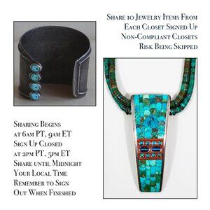 🍎 Share 10 Jewelry items from the members signed in for the day Make sure all of your items are Posh Compliant. It is essential that correct and accurate descriptions are made of your items so your buyer will be confident in his/her purchase from your Closet Thank You!