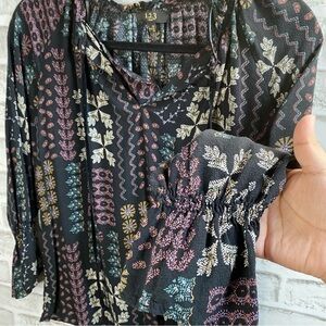 Pretty black multi color floral pattern throughout the blouse with a velvet trim and tie strings