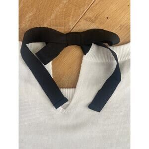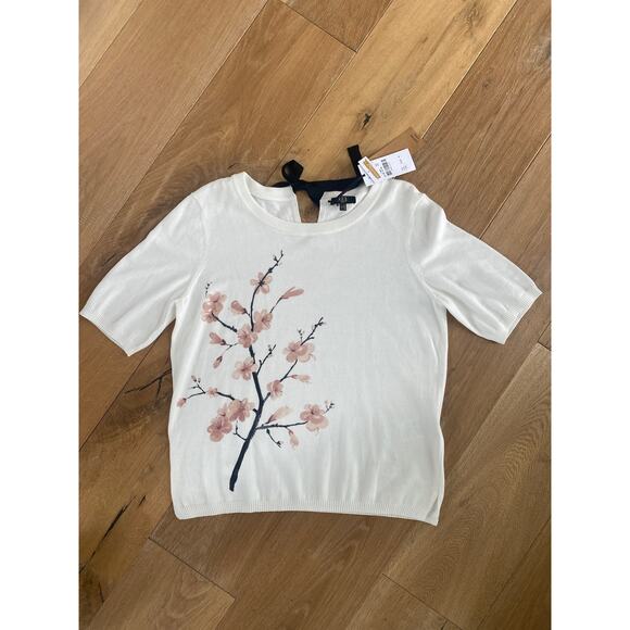 Beautiful lightweight cotton sweater. Short sleeves, pretty black and pink floral print on front, scoop neck with black ribbon tie at the back neck.