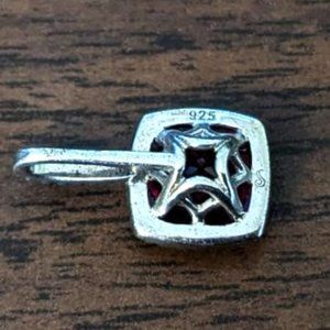 1.25 carat natural ruby gemstone with round cut with prong setting into a rounded-square sterling silver pendant. The ruby gemstone has a brilliant deep red with flashes of dark magenta color. Pendant is stamped with 925. Gemstone measures approx. 7mm in diameter. The pendant measures approx. 15mm tall and 8mm wide.