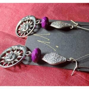 New detailed earrings by Vu. Silver plated sun & moon charms attached to purple faceted beads. On hooks, 4".