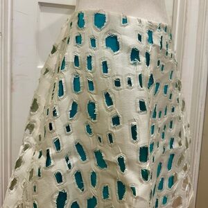 This is a new with tags, never worn a-line skirt by Prabal Gurung. I am not the first owner. I purchased it from someone else, but it seems to have been stored for a long time as the color is not a stark white and has more of a yellow sheen in certain lighting. It’s still a gorgeous piece, I just didn’t like the “other fibers” overlay on the skirt. It feels a bit like a plasticy paper? I believe this brand may use European sizing as this fit smaller than an 8, so I am listing it as a 4/6. For reference, it fit me very well and I am a size 4/6. It is slightly longer than knee-length on me at 5’4”.