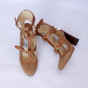 ITS a Nicely Handled Pair of Jimmy Choo 100 Hazel Suede And Leather Booties With Studs. These are pre-owned in good condition. The toes are slightly scuffed and there is a black spot on the right ankle of the shoe and a spot on the Left strap. There is some discoloring on the inside of the leather. One Stud is missing as seen on pictures.