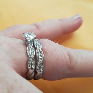 1.25 Round cut CZ bridal ring set. Total carats in both rings 1.75. Size 9. I wear this set in size 10. Beautiful and classic. LOVE IT!!! I love CZ jewelry for everyday wear, business travel and vacations. But, you can see in the photo that a 9.5 or 10 size ring would work better on my ring finger. It's TRUE to size 9. Rhodium plated setting. Rhodium is approximately 6X more expensive than gold and is known for having high reflective quality for jewelry. Rhodium is found in platinum ore. I've worn the same set in size 10 for 5 years with no sign of wear. Just beautiful.