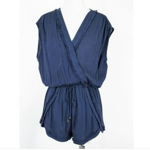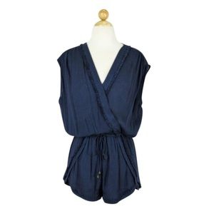 Heartloom Mari Romper Navy Blue Featuring a Surplice neckline with double snap button closure. Elasticized drawstring waist with bead accents. Frayed trim. Back keyhole with button closure. Super cute on! Like new, NWOT.