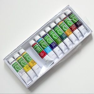 Contains 11 colors (from left to right): Titanium White, Lemon Yellow, Medium Yellow, Crimson, Blue Lake, Phthalo Blue, Light Green, Phthalo Green, Yellow Ochre, Burbt Sienna, and Mars Black.