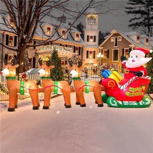🧿【Giant Outdoor Christmas Decor】12FT Christmas luxurious inflatables santa claus on"Merry Christmas"sleigh with three reindeer deer to celebrate Christmas,deliver Christmas gifts and New Year wishes to kids. Build-in LED Lights,the super bright colored LED light will illuminate your yard and easily attract the guests, friends, and kids' attention so that can be the most attractive & Christmas decorations outdoor in your neighbors. And it will become a popular impromptu Instagram photo spots!