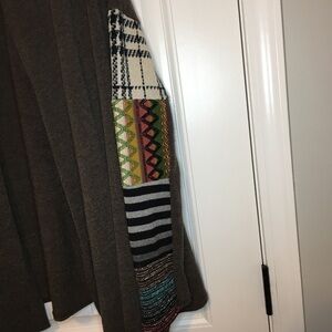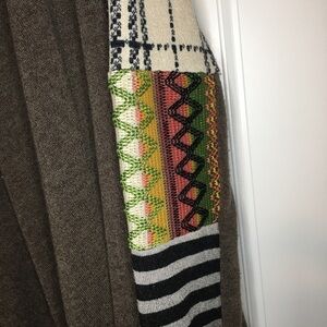 Brown in color with a fun mix of colors and textures on the sleeves!