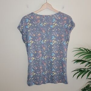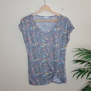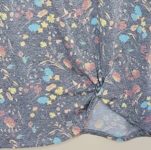 Heathered gray short sleeve cuffed v-neck tee with knotted front and a muted colorful floral print.