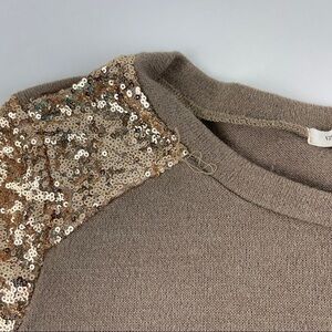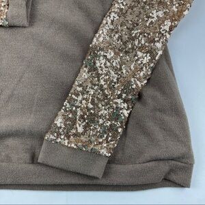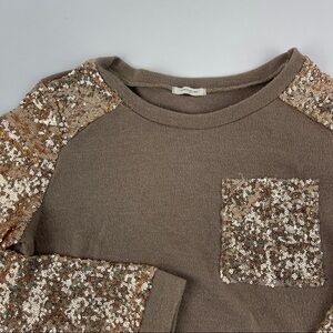 12PM by Mon Ami Sweater Womens Brown Gold Sequins Long Sleeve Pocket