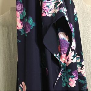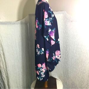 Navy blue multi-colored floral print Kimono style cardigan. Last picture it's a very similar item, but not the actual garment. I included as a fit example. Pre-owned in good condition. Please refer to pictures for best description and condition verification.
