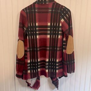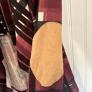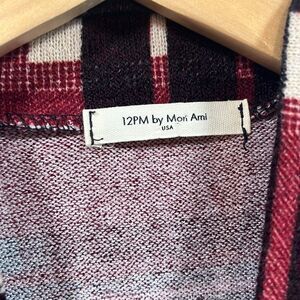 12PM by Mori Ami black and red striped open front cardigan with elbow patches