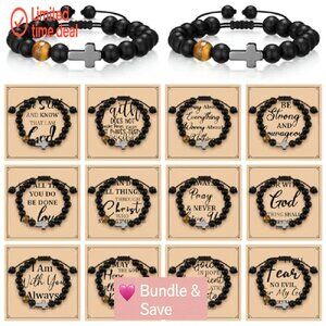 • Style: Stretch bracelet with a classic cross charm and round black gemstone beads. Includes 12 inspirational Bible verse cards with matching envelopes.