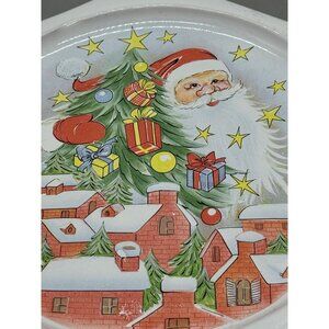 This ceramic plate features a festive depiction of Santa Claus, a decorated tree, and a snowy village, framed by embossed holly details.
