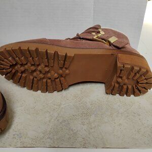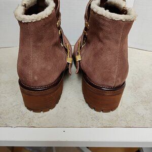 The image you provided shows a pair of Sporto's Katie women's suede ankle boots. These boots have a stylish design with lace-up fronts and gold-tone hardware. They also feature a cozy lining, likely made of shearling or faux fur, which makes them suitable for colder weather.