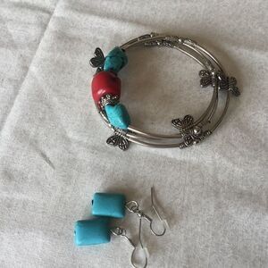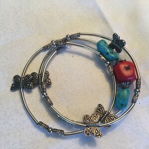 Very gently used as shown in photos. This silvertone coil bracelet features butterfly charms, a coral piece and blue nuggets. Also included is a pair of silvertone wires blue stone earrings.