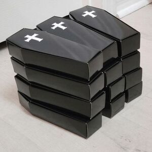 This set includes 12 pre-assembled black coffin-shaped paper treat boxes. These coffin boxes are sturdy, practical, and ready to use as party favors, candy holders, or decorations.